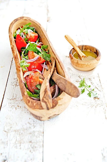 Deze opscheplepels van Bowls and Dishes Pure Olive Wood zijn gemaakt van hout van olijfbomen die hun productiefunctie hebben verloren. De slacouvert is 25 cm lang en 5,5 cm breed. Geschikt voor het opscheppen van salades. Eén van de lepels is getand, zodat ook kleine ingrediënten mee worden opgeschept. Bijvoorbeeld pijnboompitten.