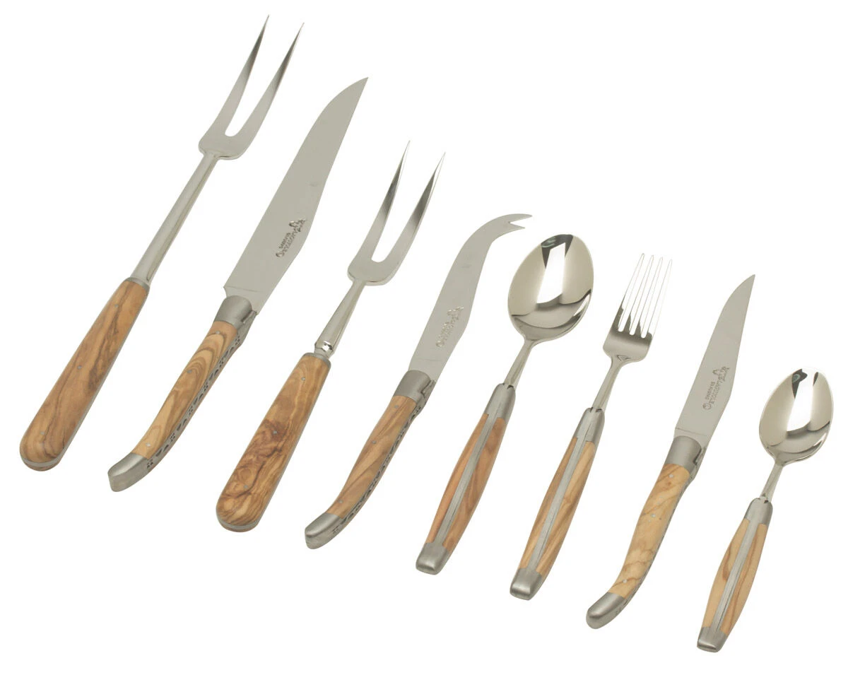 De Laguiole en Aubrac bestekcassette bestaat uit een 6 persoons, 28 delig bestek met olijfhouten heften. De roestvrijstalen delen van het bestek zijn deels mat geborsteld en deels glanzend gepolijst uitgevoerd.