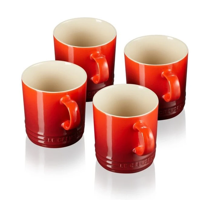De Le Creuset mokken zijn gemaakt van roodgekleurd, geglazuurd aardewerk en heeft een glanzende afwerking. Met een inhoud van 350 ml zijn de mokken geschikt voor thee, soep of warme chocolademelk. De mokken worden geleverd in een set van 4 stuks.Â