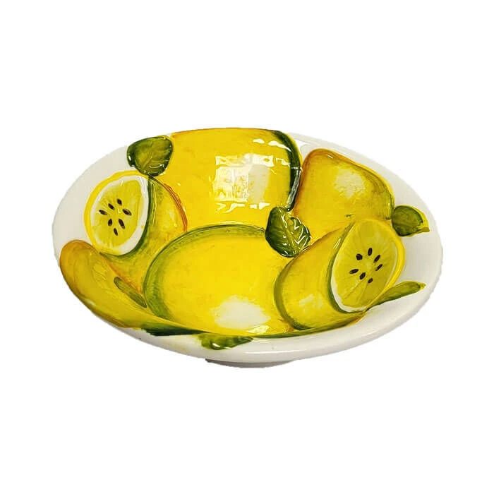 De ronde Oldenhof schaal is gemaakt van wit aardewerk en is gedecoreerd met citroenen en bladeren. De diameter van de schaal is 16 cm. Het schaaltje is gemaakt om te gebruiken als fruit- of dessertschaaltje, maar ook voor het presenteren van hapjes.