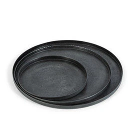 De Oldenhof Graphite schaal met zandstructuur is gemaakt van matgrijs aluminium. Het large plateau heeft een diameter van 35 cm en is 1 cm hoog. Gebruik de schaal als plateau om kaarsen op neer te zetten, of als presentatieschaal voor borrelhapjes of andere etenswaren.