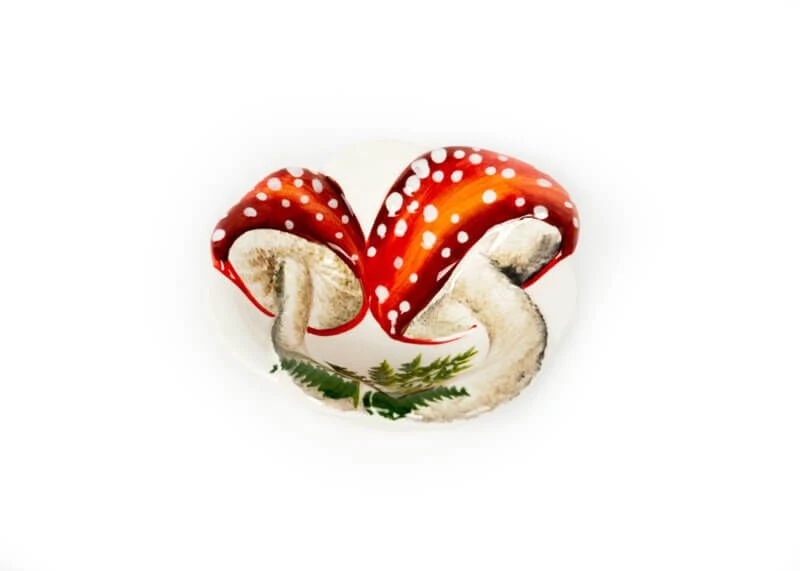 Oldenhof’s rood/witte schaal is voorzien van handgeschilderde paddenstoelen. De schaal is gemaakt van keramiek en heeft een diameter van 15 cm. Het design is 5 cm hoog en te gebruiken als fruit- of dessertschaaltje, maar ook voor het presenteren van hapjes.